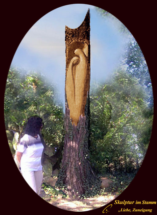 Skulptur im Privat-Park -Liebe Zuneigung - im Kiefernstamm 14 geschnitzt, naturbelassen.